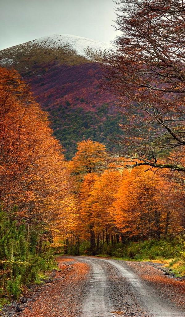 Wallpaper Road in the autumn forest at the foot of the mountain, Chile