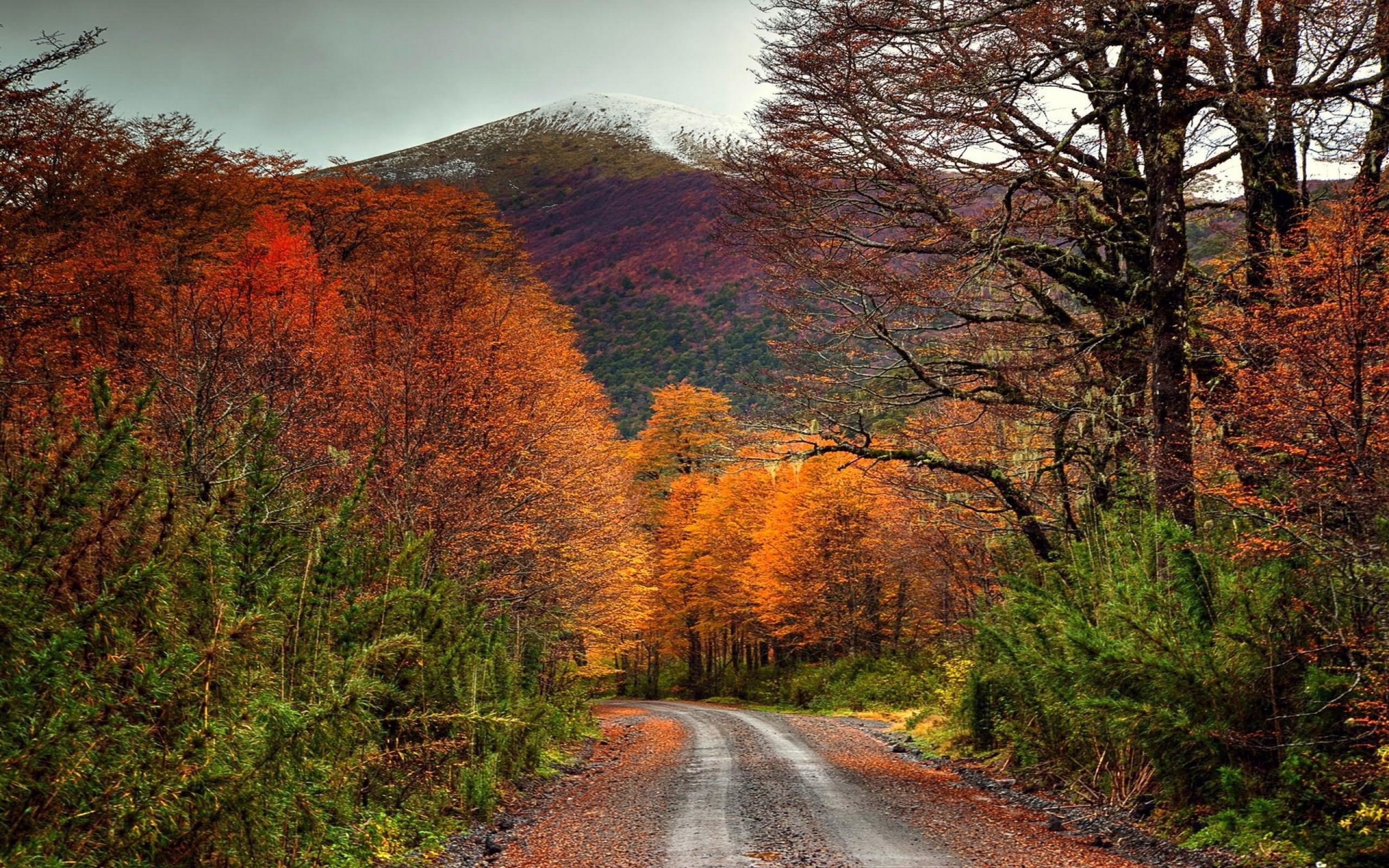 Wallpaper Road in the autumn forest at the foot of the mountain, Chile