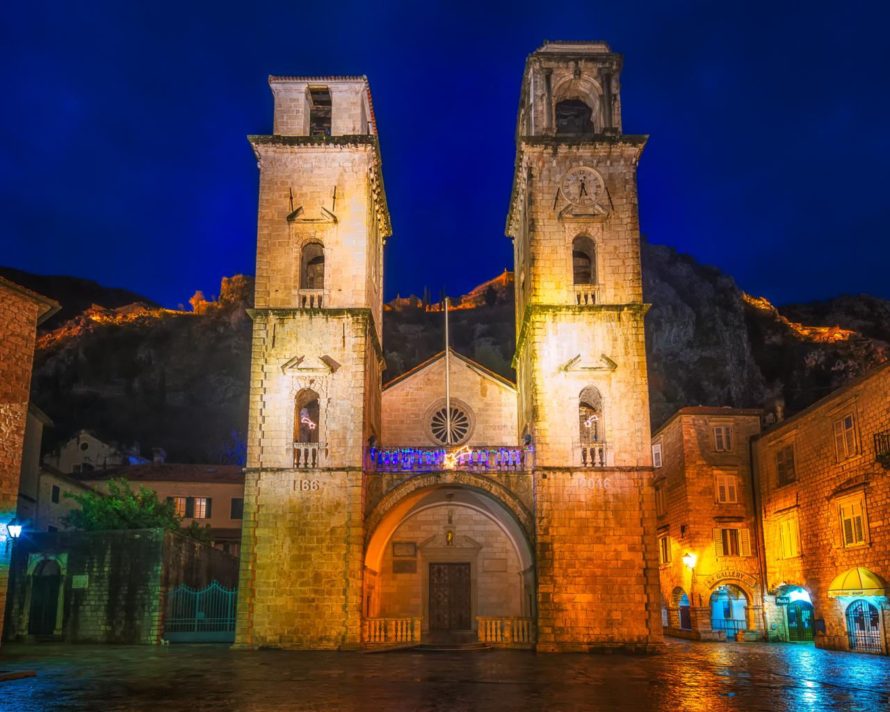 Wallpaper View of St. Trifon`s Cathedral at night, Montenegro