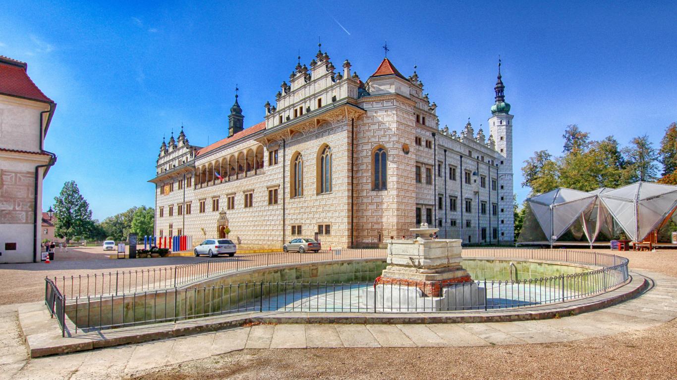Wallpaper Litomyšl Castle with a fountain under the blue sky, Czech Republic