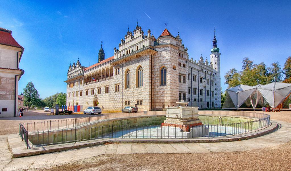 Wallpaper Litomyšl Castle with a fountain under the blue sky, Czech Republic