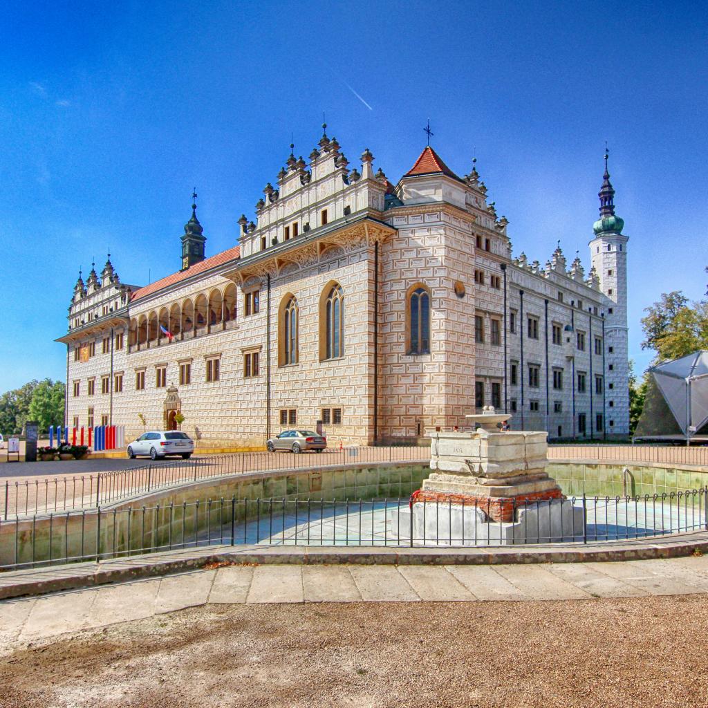 Wallpaper Litomyšl Castle with a fountain under the blue sky, Czech Republic
