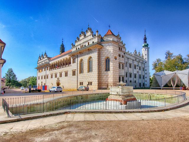 Wallpaper Litomyšl Castle with a fountain under the blue sky, Czech Republic