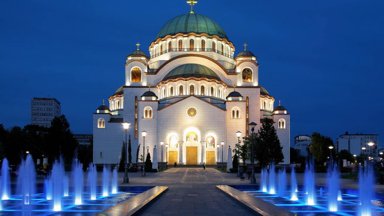 Wallpaper Fountains near the Temple of Saint Sava in the evening, Belgrade. Serbia