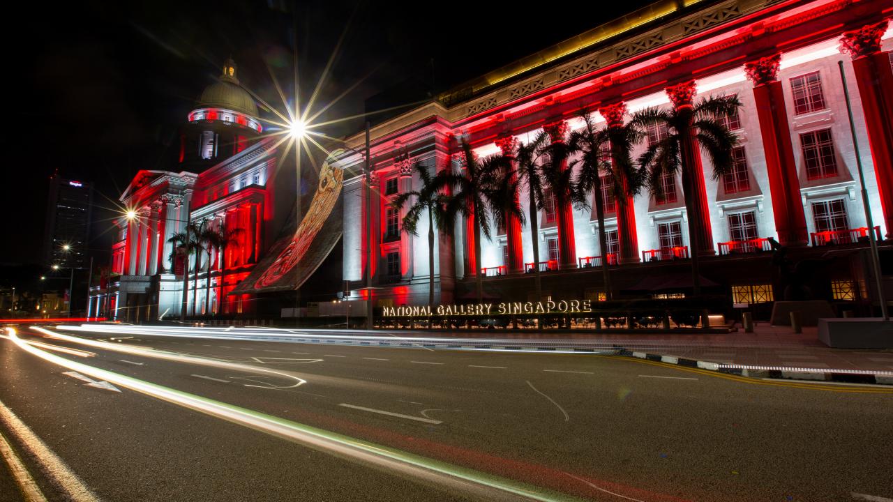 Wallpaper Red building of Singapore National Gallery at night, Asia