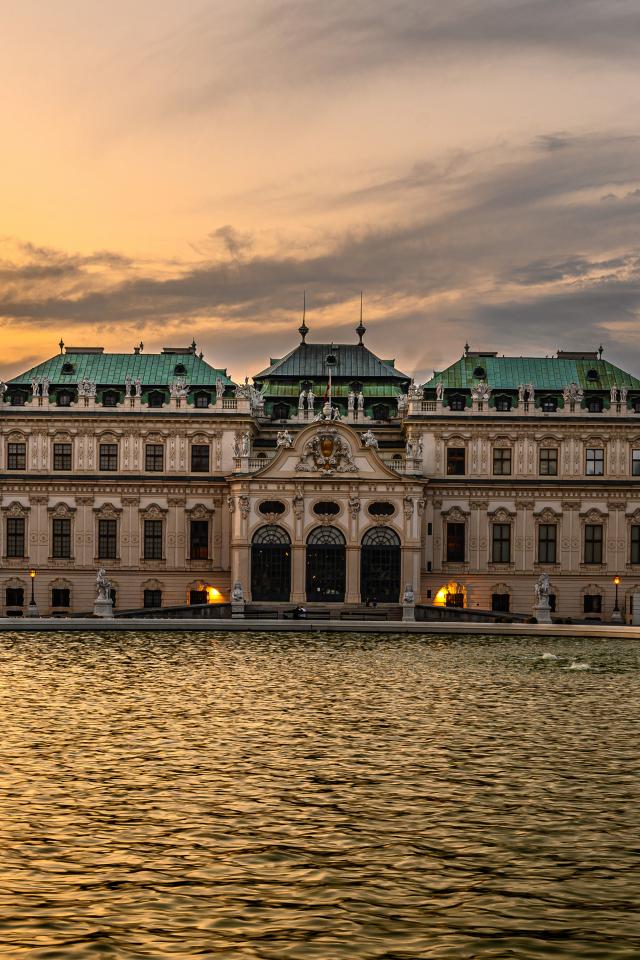 Wallpaper Old building by the water at sunset, Austria
