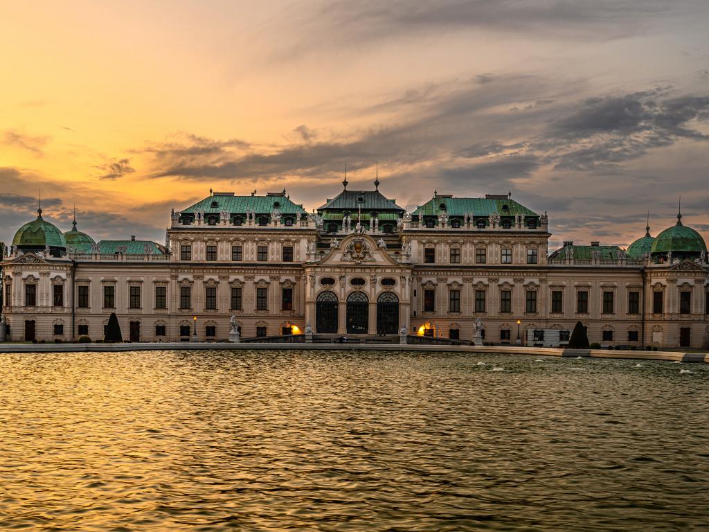 Wallpaper Old building by the water at sunset, Austria