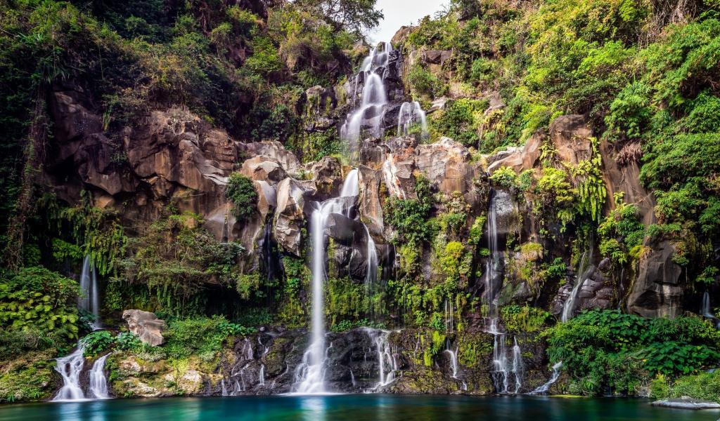 Wallpaper Waterfall flows down from a high cliff to the stones