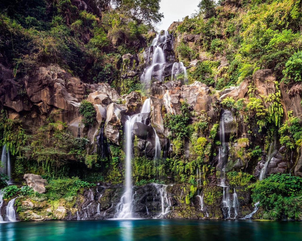 Wallpaper Waterfall flows down from the cliff into the lake