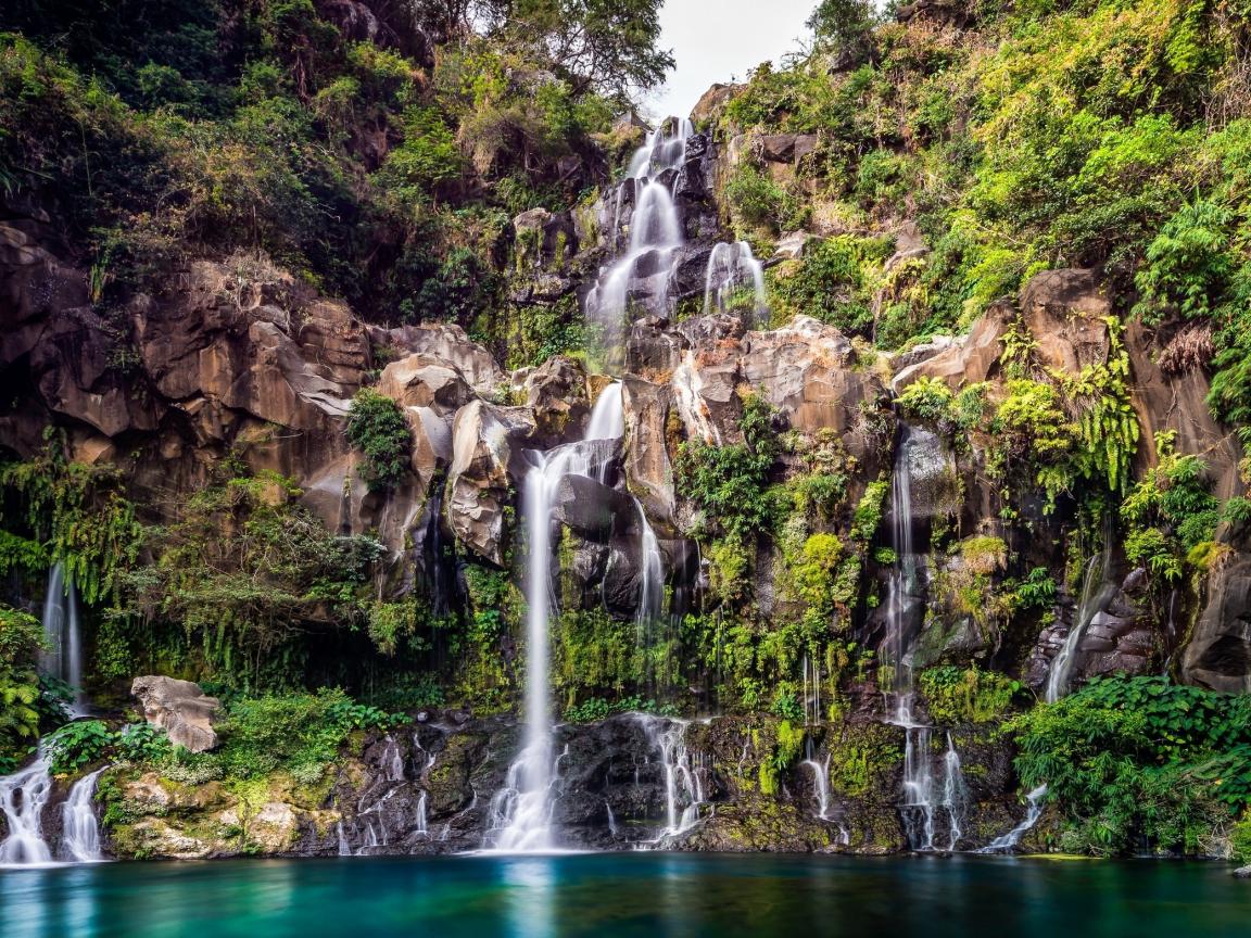 Wallpaper Waterfall flows down from a high cliff to the stones