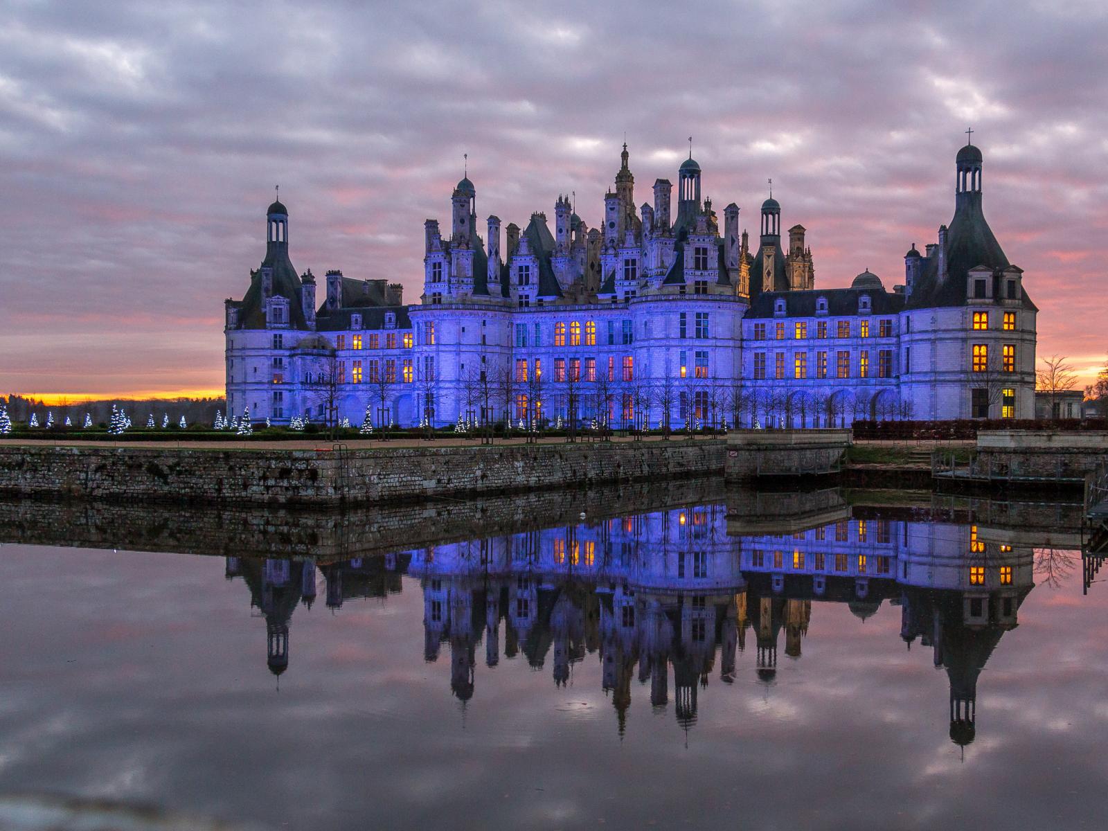 Wallpaper Chambord castle reflected in the water at dusk, France