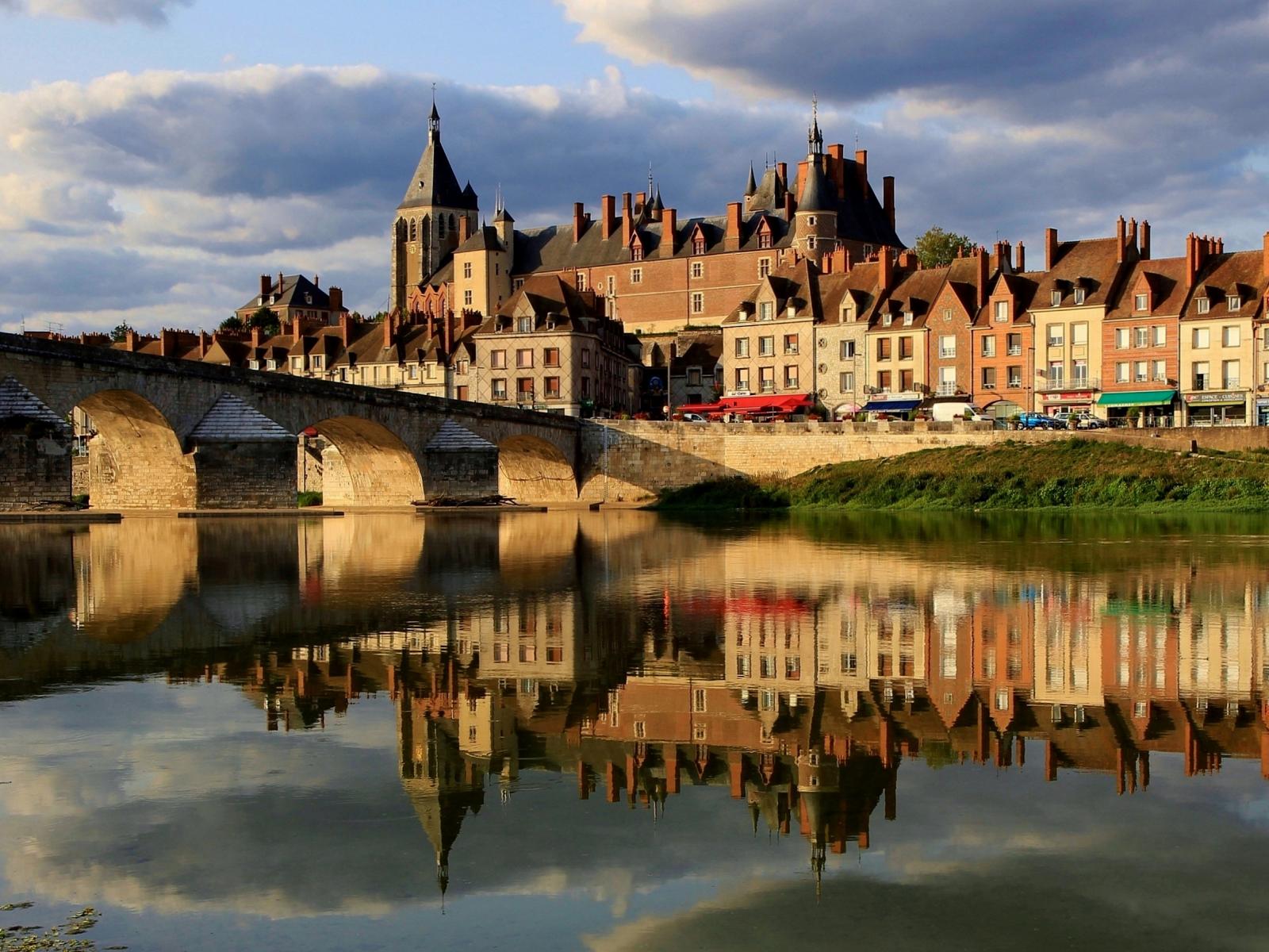 Wallpaper Large house is reflected in the river near the bridge, France