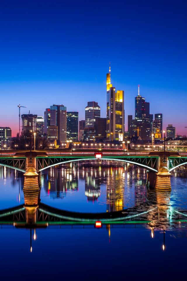 Wallpaper The night city of Frankfurt is reflected in the water, Germany