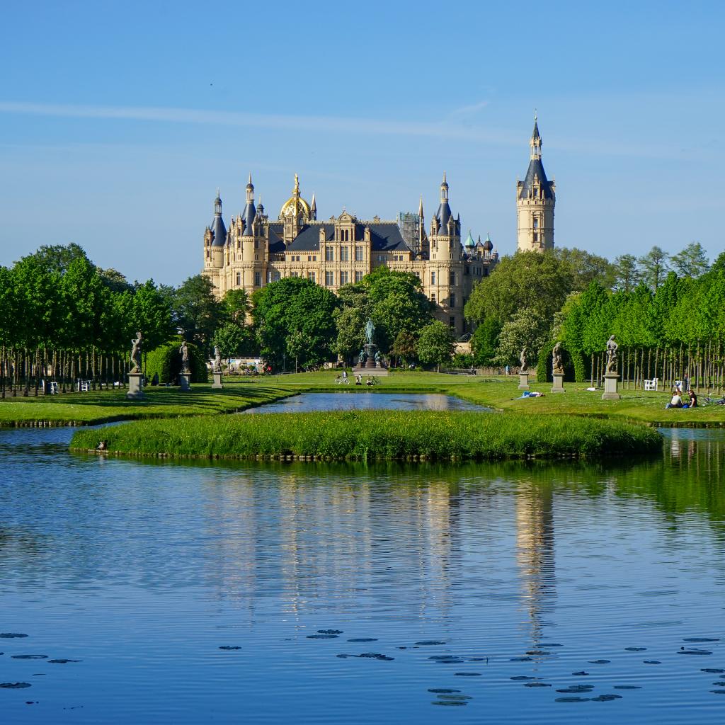 Wallpaper View of the beautiful Schwerin Castle by the pond, Germany
