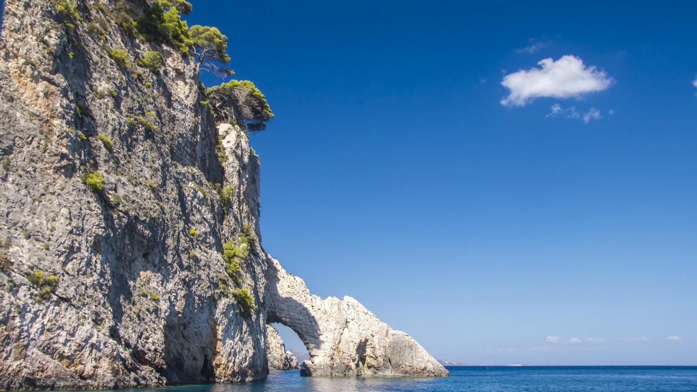 Wallpaper Stone cliff with an arch into the sea, Zakynthos island. Greece