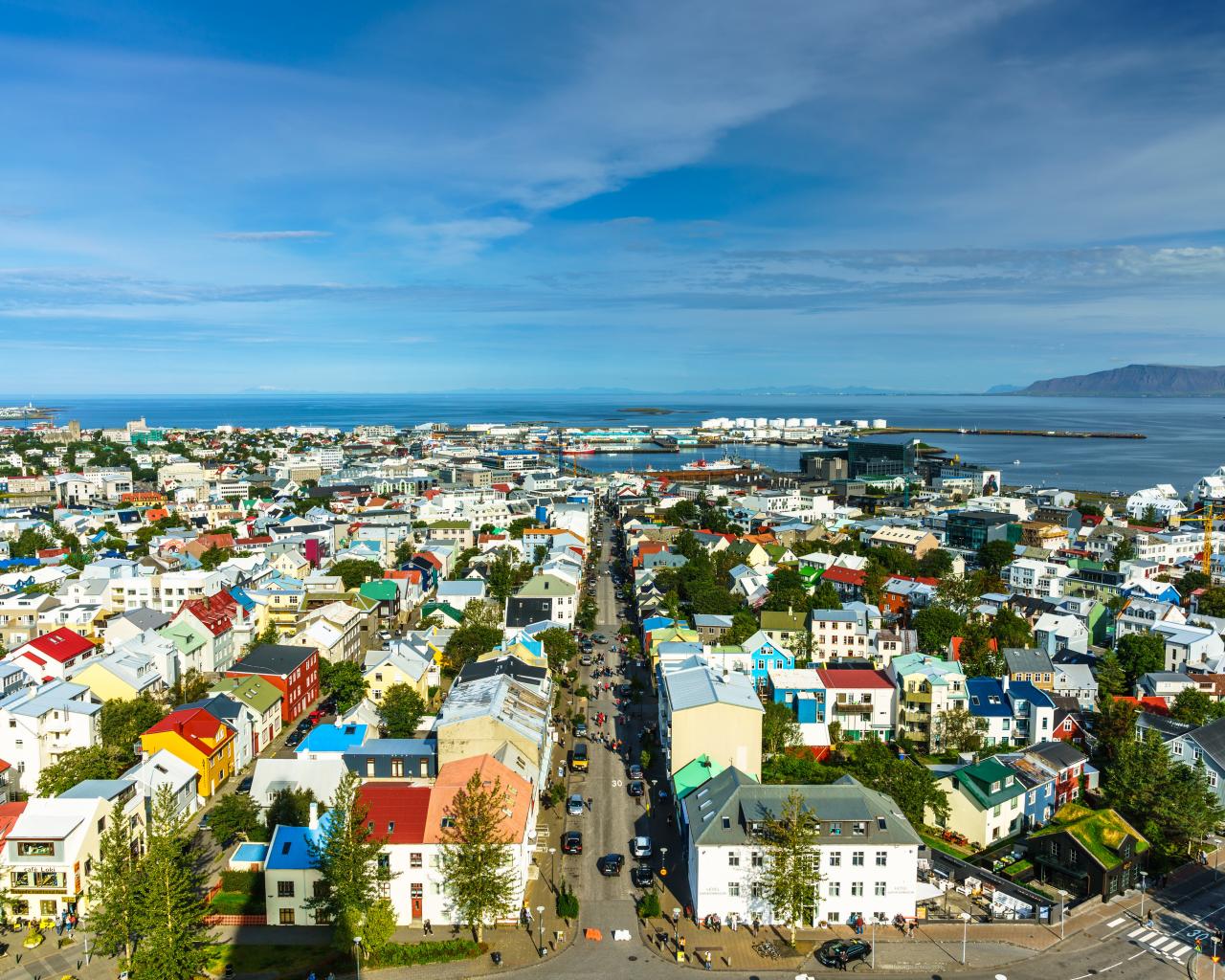 Wallpaper View of houses in a city under a blue sky, Iceland