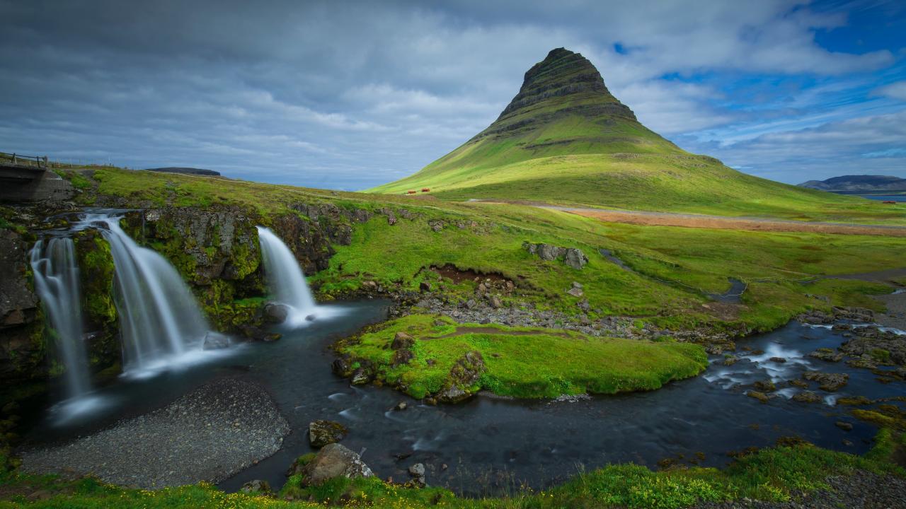 Wallpaper View of a small waterfall and a verdant mountain, Iceland