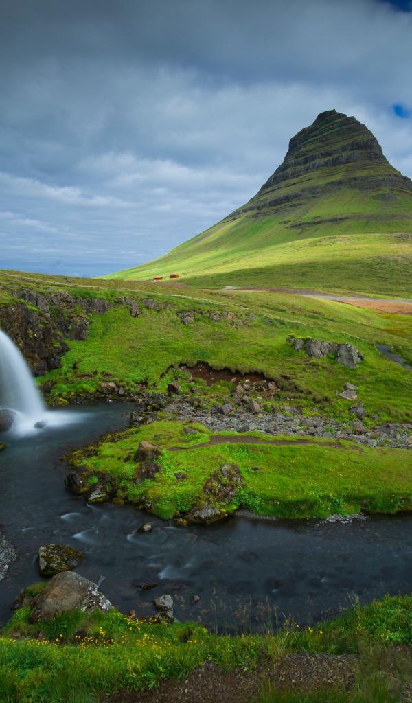 Wallpaper View of a small waterfall and a verdant mountain, Iceland