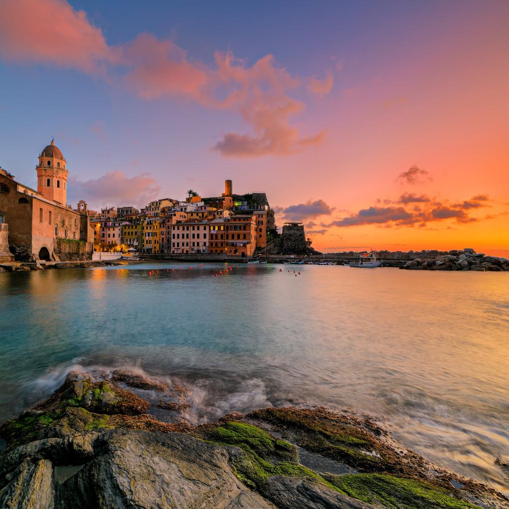 Wallpaper City of Vernazza on the beach at sunset, Italy