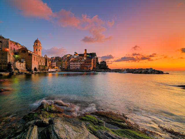 Wallpaper City of Vernazza on the beach at sunset, Italy
