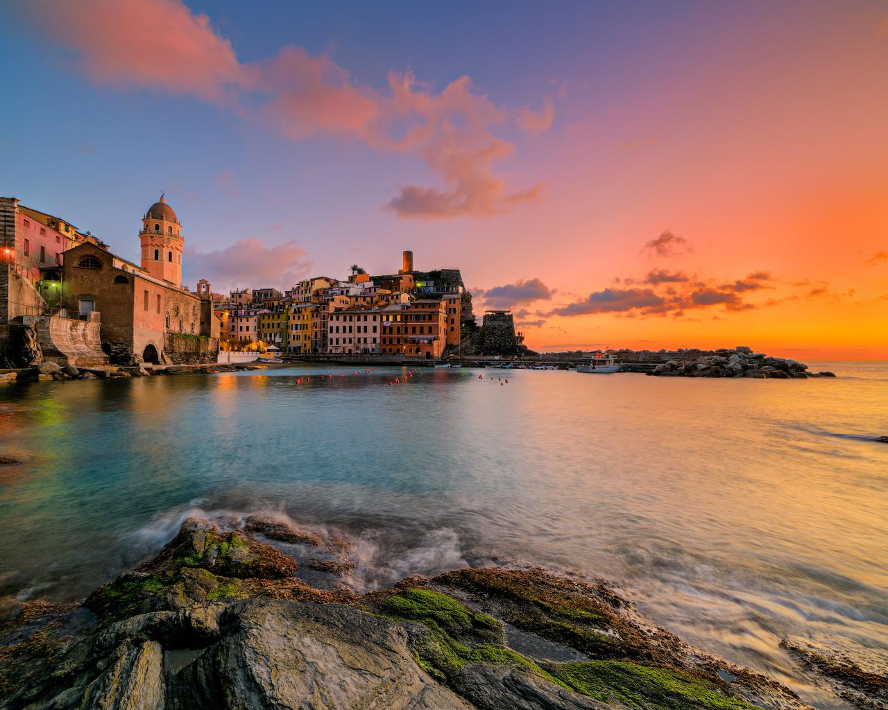Wallpaper City of Vernazza on the beach at sunset, Italy