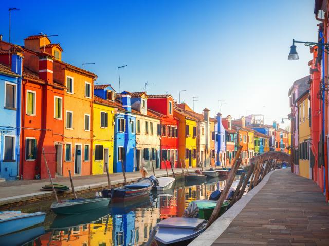 Wallpaper Multi-colored houses by the water channel with boats, Italy