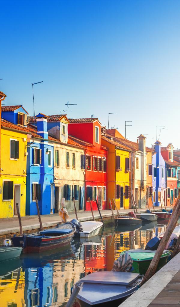 Wallpaper Multi-colored houses by the water channel with boats, Italy