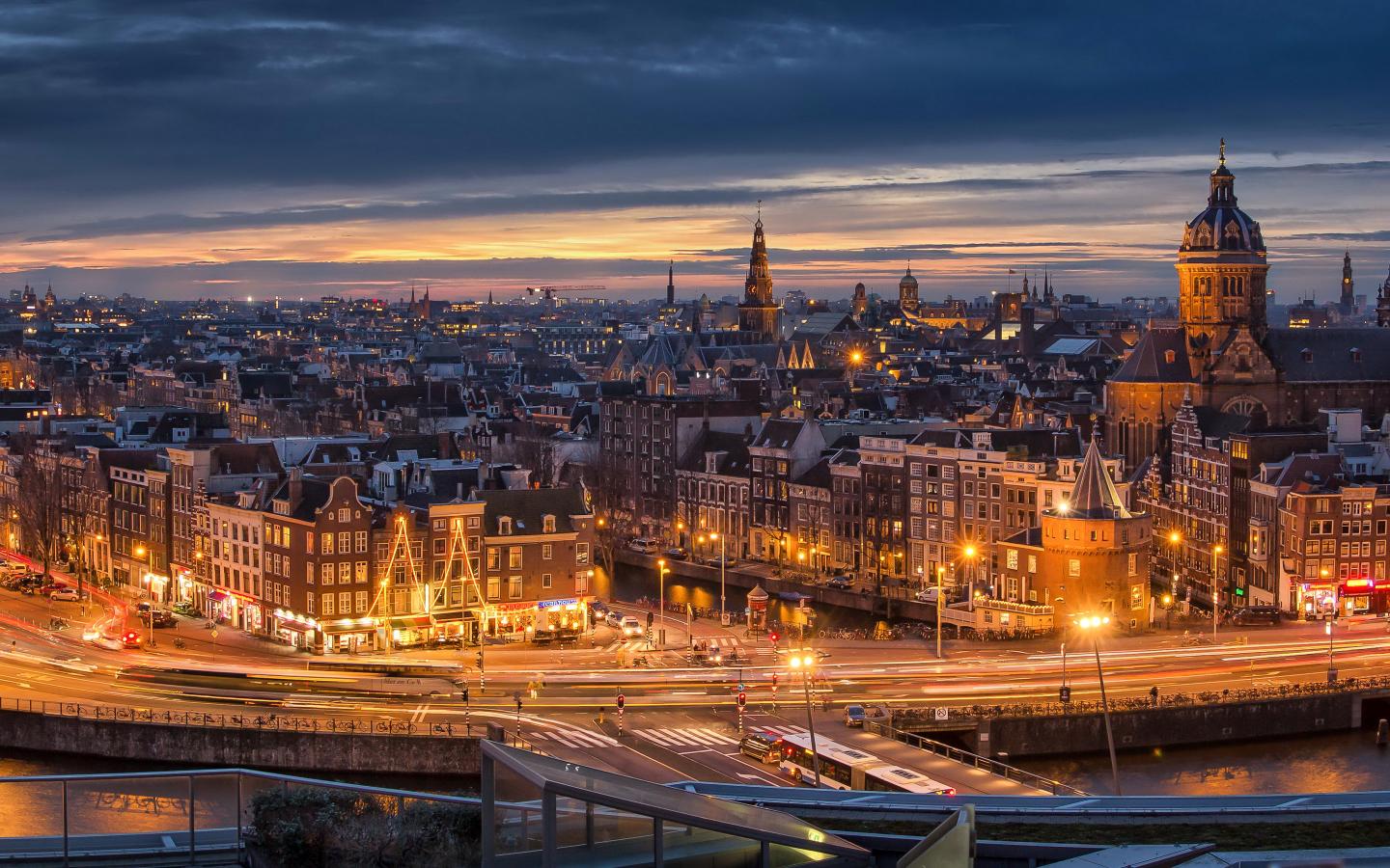 Wallpaper View of the night city of Amsterdam, Netherlands