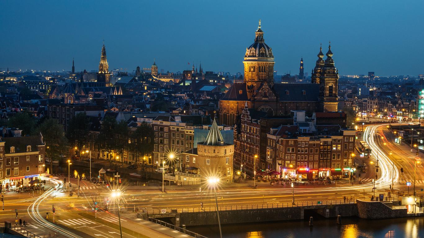 Wallpaper Panorama of the night city of Amsterdam, Netherlands