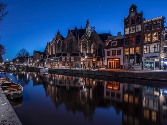 Wallpaper Houses reflected in canal water at night, Netherlands