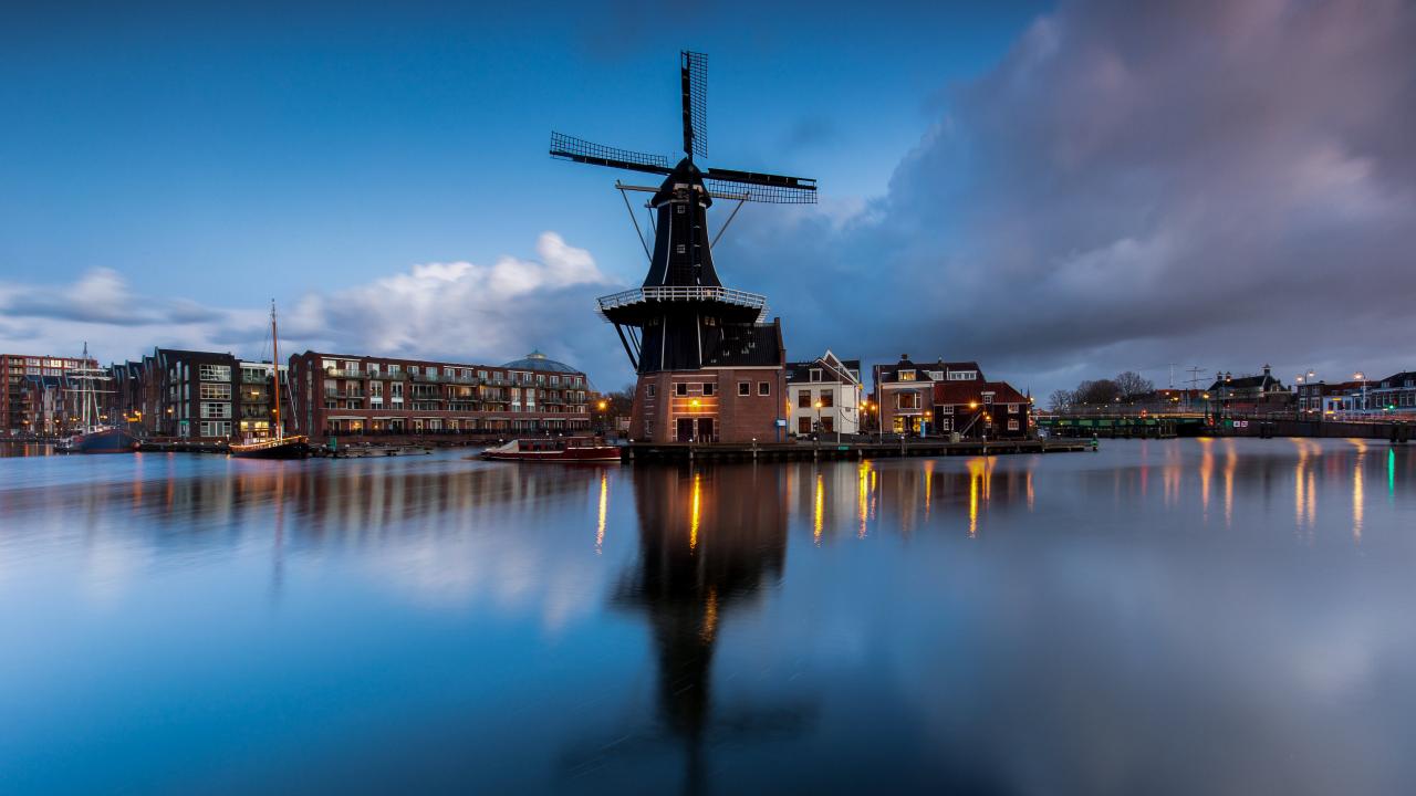 Wallpaper Old mill by the river in the evening, Netherlands