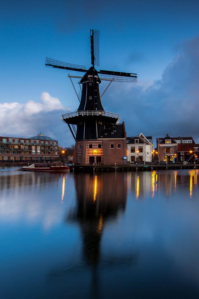 Wallpaper Old mill by the river in the evening, Netherlands