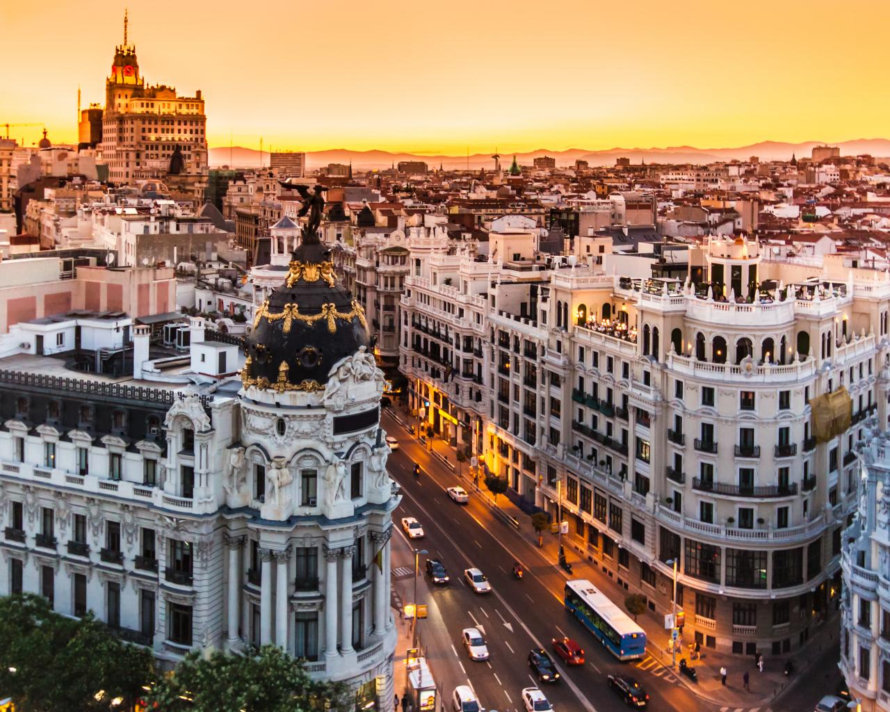 Wallpaper Streets of Madrid under a cloudy sky, Spain