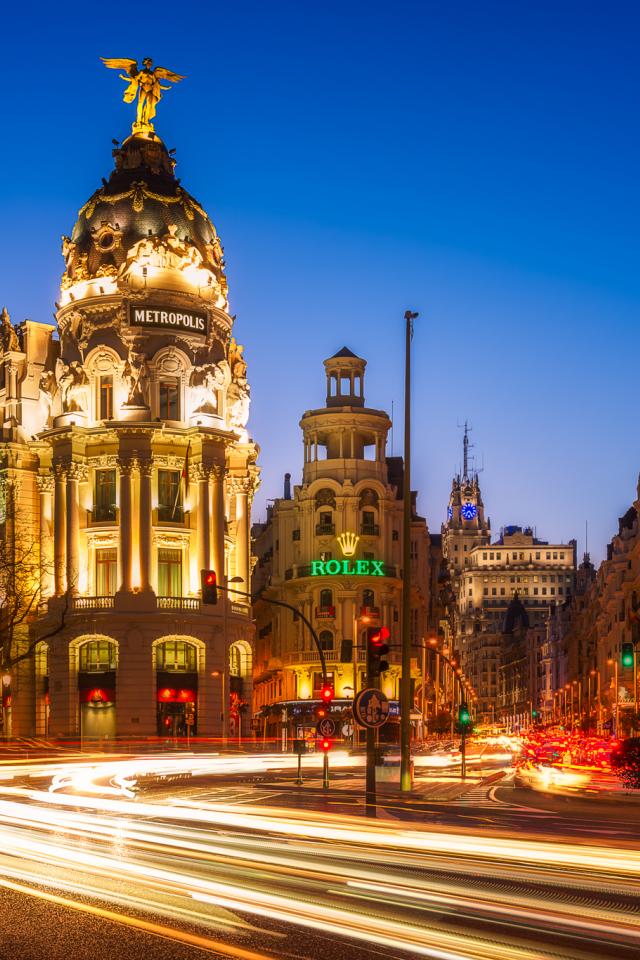 Wallpaper Houses in the evening street in the city of Madrid, Spain