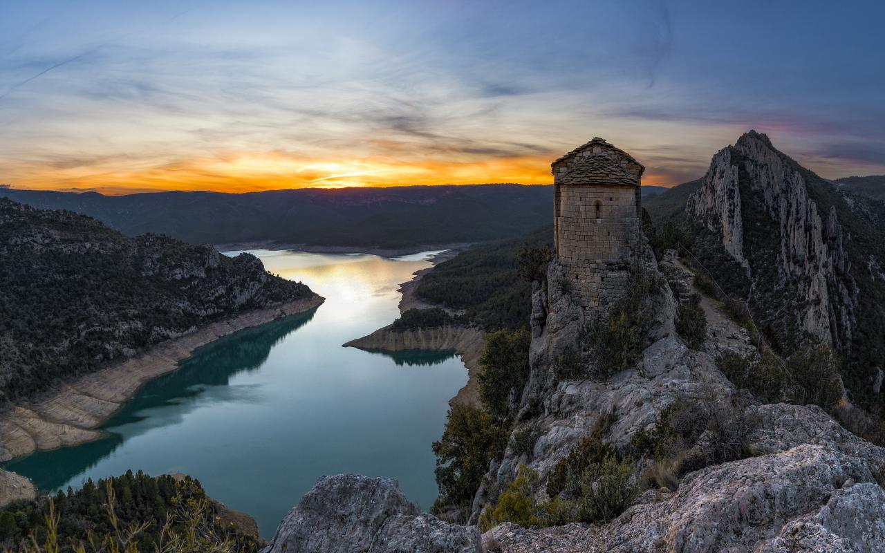Wallpaper View of an old temple on a cliff top above a river, Spain
