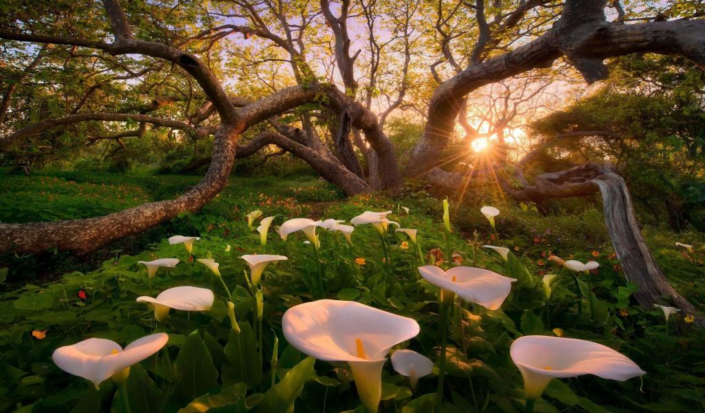 Wallpaper White lilies under a tree, California United States