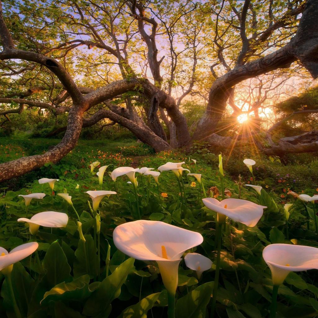 Wallpaper White lilies under a tree, California United States