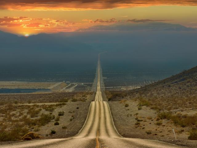 Wallpaper Straight road descends from the mountains, California
