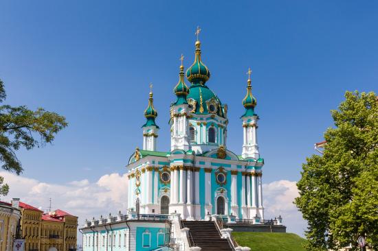 Wallpaper View of the beautiful St. Andrew`s Church under the blue sky, Kiev. Ukraine