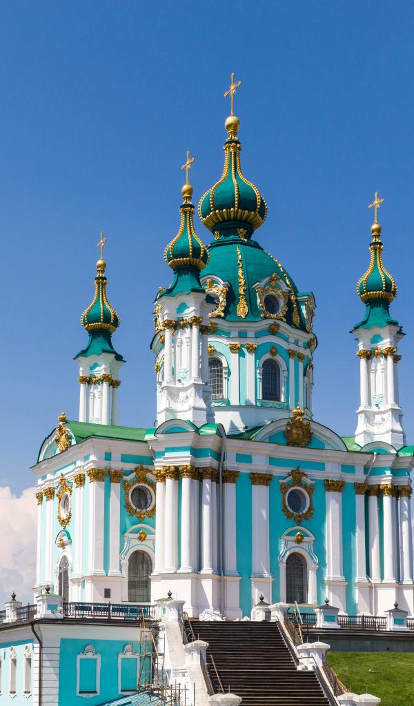 Wallpaper View of the beautiful St. Andrew`s Church under the blue sky, Kiev. Ukraine