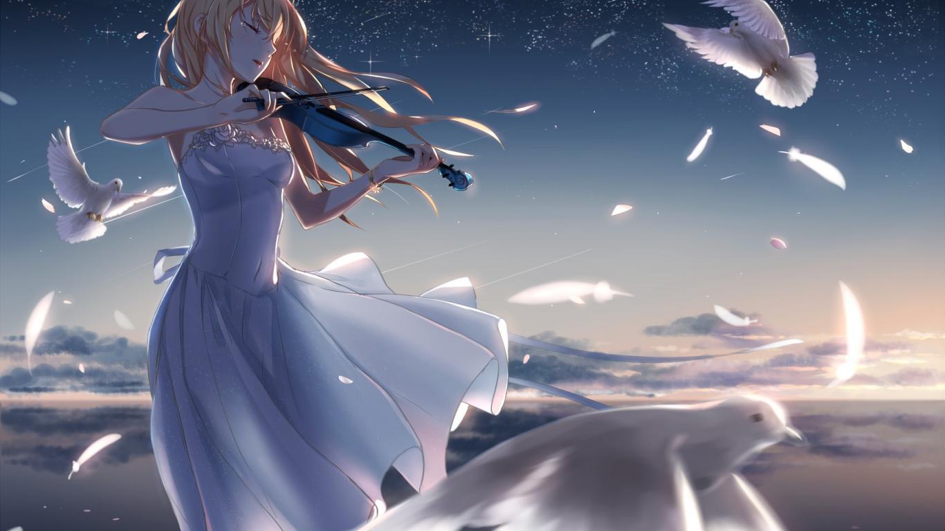 Wallpaper She plays the violin among the pigeons, anime