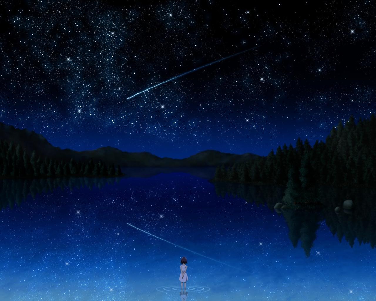 Wallpaper Comet in the night sky over the lake, anime