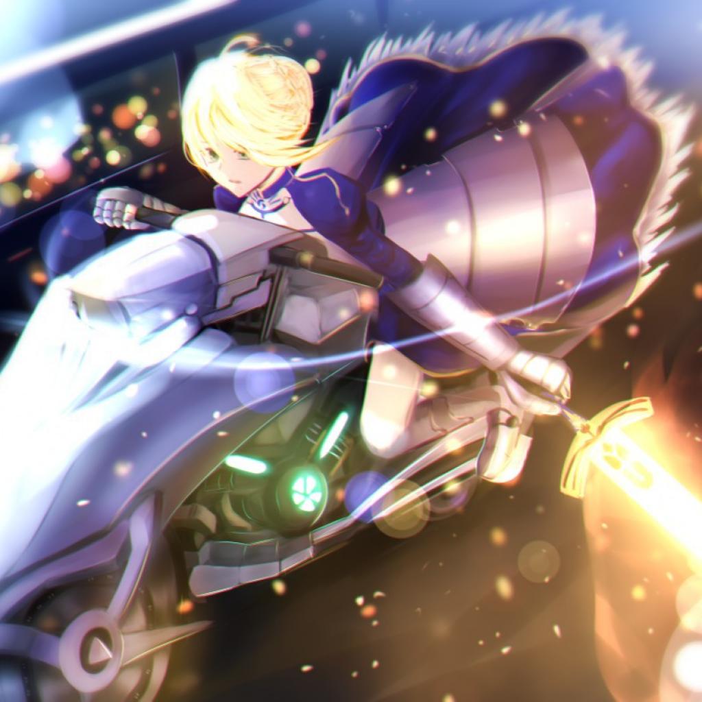 Wallpaper Blonde Cyber races on a motorcycle in the anime Fate Series