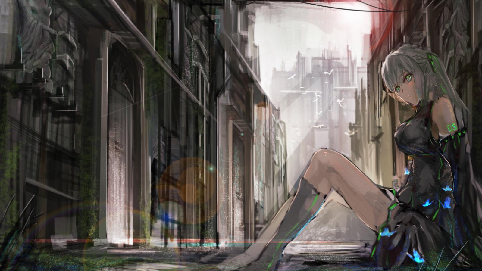 Wallpaper The green-eyed Vocaloid sitting against a wall on the street