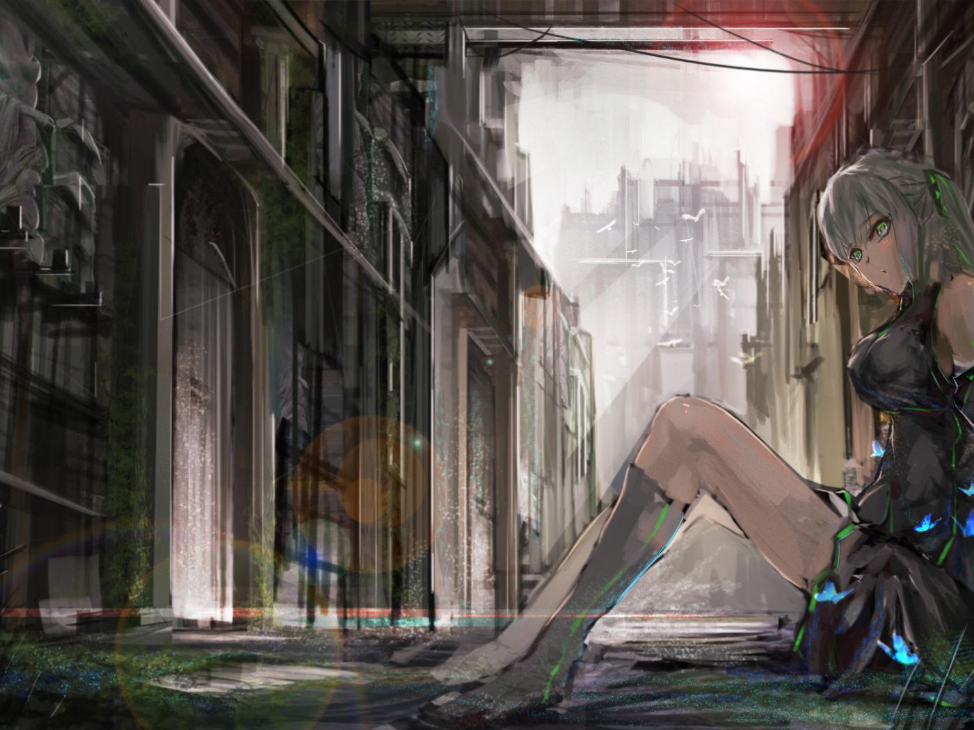 Wallpaper The green-eyed Vocaloid sitting against a wall on the street