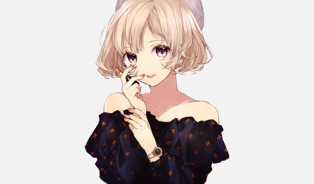 Wallpaper Anime girl blonde with lipstick in hands on a white background