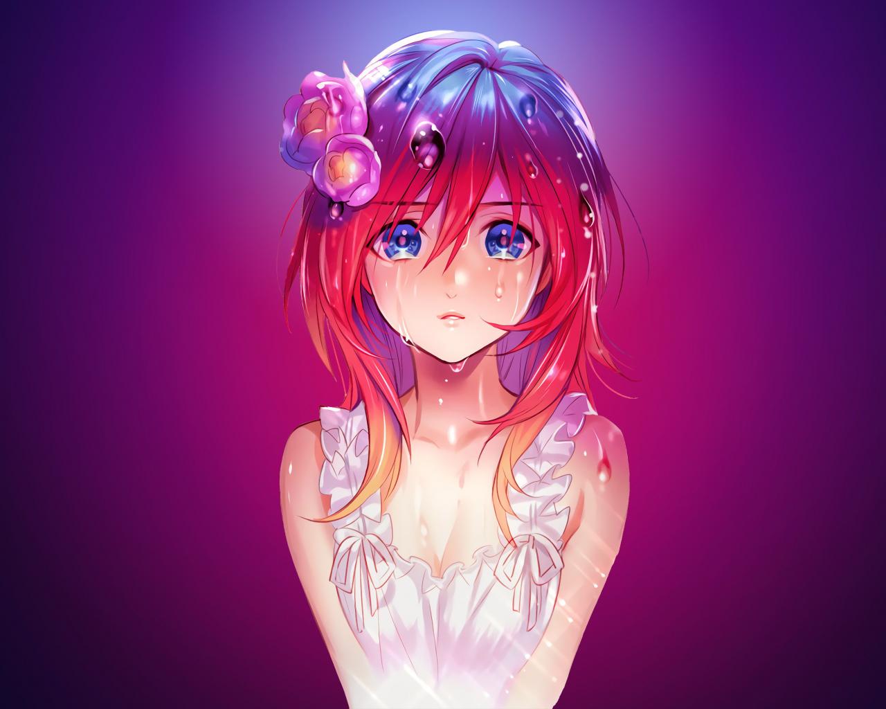 Wallpaper Drops of water flow down the hair anime girl