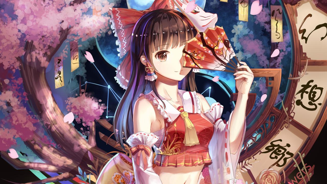 Wallpaper Anime girl Reimu Khakurei with fan in hand