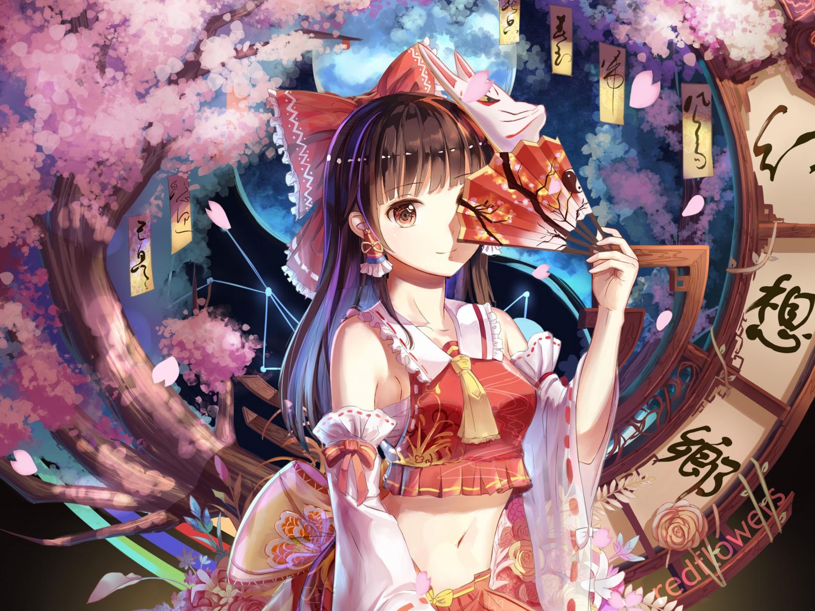 Wallpaper Anime girl Reimu Khakurei with fan in hand