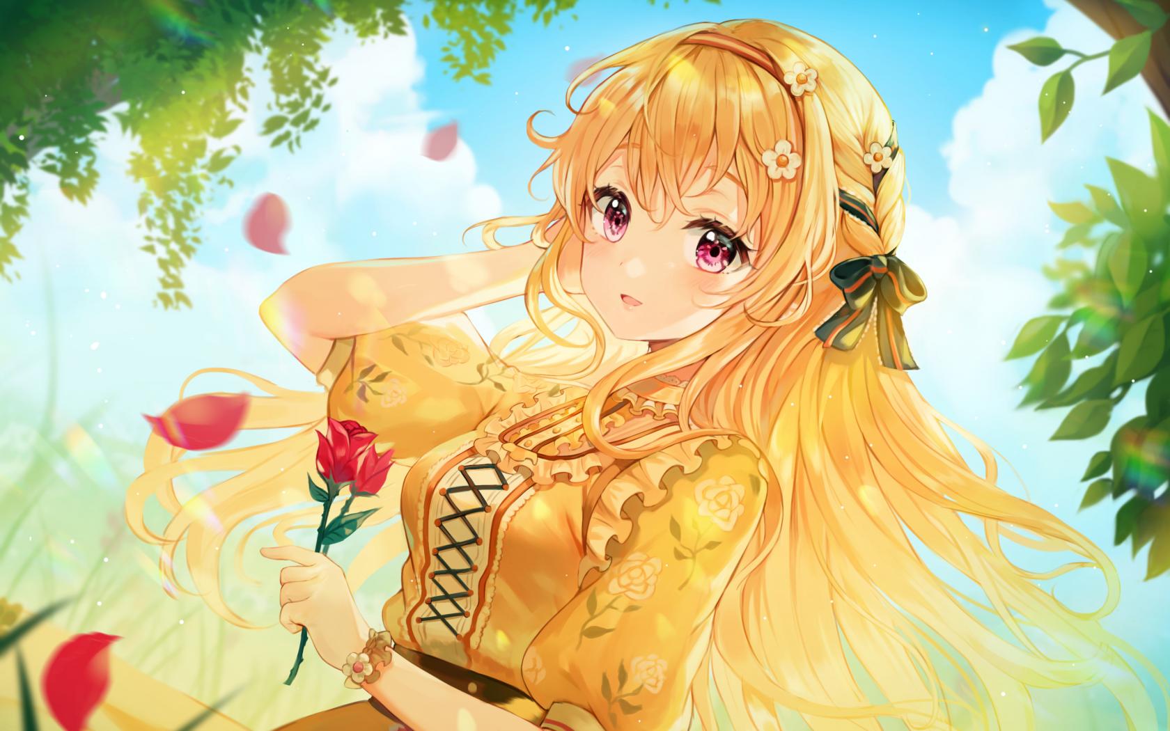 Wallpaper Beautiful red-haired anime girl with a rose in hand